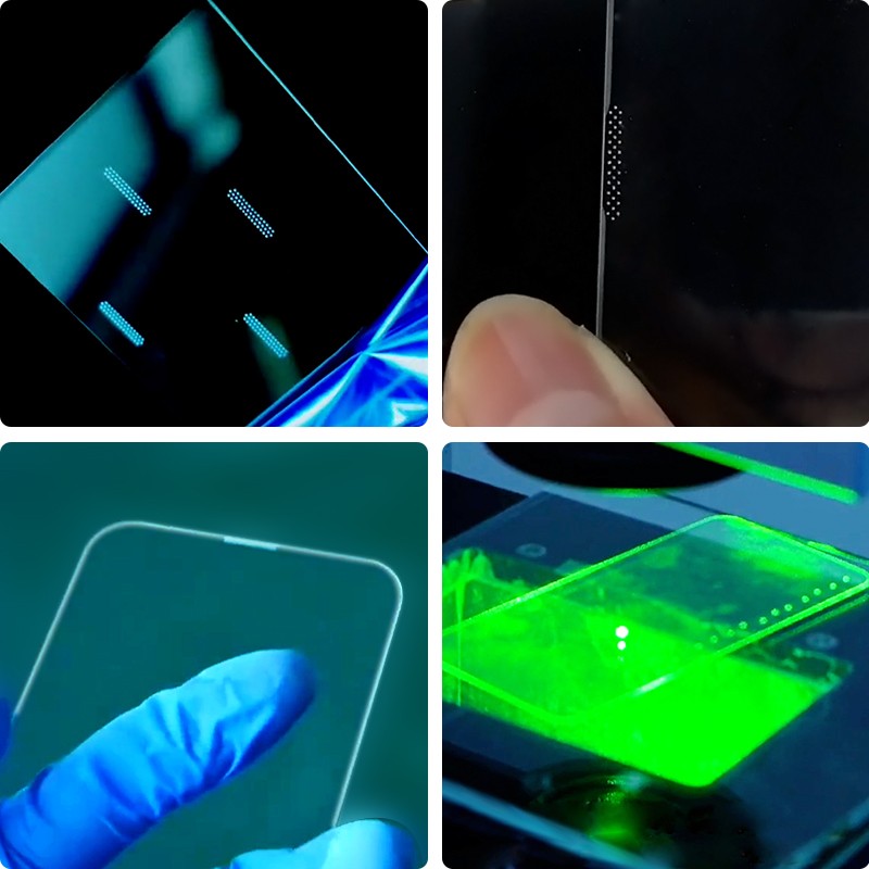 手机屏幕玻璃盖板听筒阵列孔激光打孔:玻璃听筒是十分脆弱的,如果某点受力稍大点就会发生破碎,用传统的玻璃打孔方式,效率低、圆度差、崩边大、损耗率高;