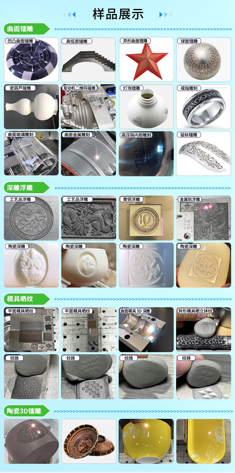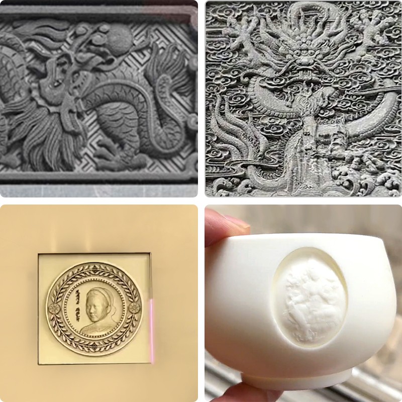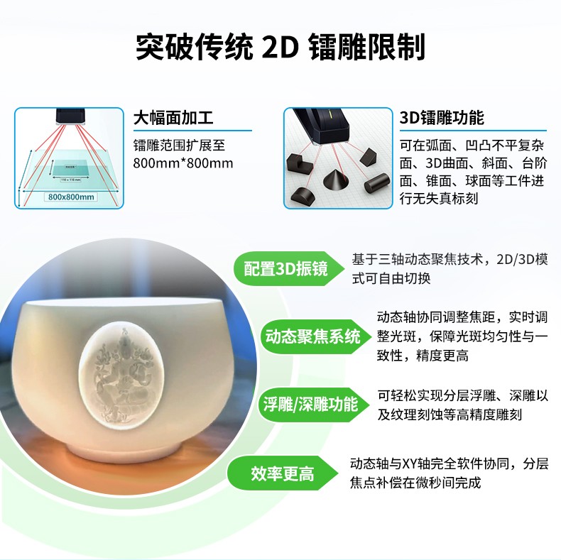 · 精雕之美:深雕、浮雕、曲面镭雕一气呵成,光斑细腻均匀,效果更出众,效率更卓越